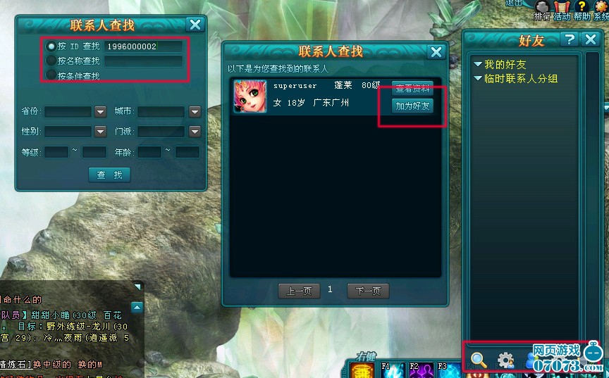 打開好友界面(快捷鍵“Alt+F”),點(diǎn)擊界面中的“查詢好友”按鈕, 在查詢表單中輸入對方昵稱或ID,再點(diǎn)“確定”,如果對方在線,會在查詢界面中顯示對方的資料,包括名字、ID、門派、性別、等級等等。找到以后可以直接加為好友。