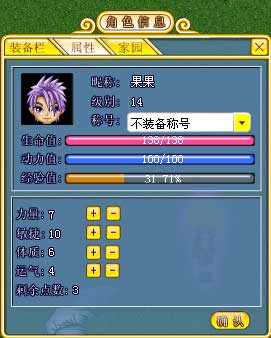 人物每次升級后,會獲得1點人物屬性點(人物屬性點數隨著人物等級的上升而增加)小提示:人物7項屬性值可以通過:升級加點,裝備,稱號,寶物來提高