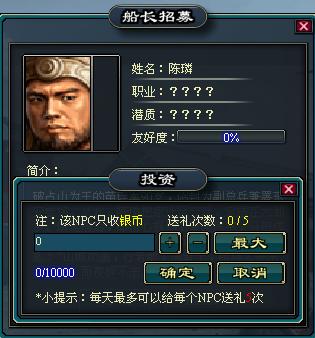 船長(zhǎng)哪里來(lái)呢?船長(zhǎng)目前是靠招募NPC來(lái)的,招募NPC是有講究滴,有些NPC只收金幣(也就是RMB),有些NPC只收銀幣。。目前先公布一個(gè)吧,見(jiàn)下圖: