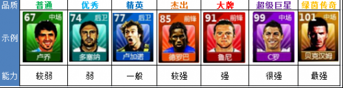 1. 標注1:球員品質。品質共分為7種,品質越高,球員的能力越高。品質按從低到高依次為普通、優(yōu)秀、精英、優(yōu)秀、大牌、超級巨星、綠茵傳奇。
