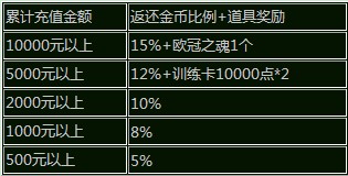活動(dòng)內(nèi)容:為了慶祝新服的正式開啟,活動(dòng)期間內(nèi),在單服內(nèi)累計(jì)充值達(dá)到一定額度,可享受不同比例的金幣返還,更有機(jī)會(huì)獲得“歐冠之魂”哦!