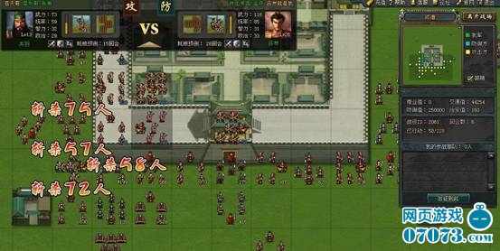 出發(fā)到其他勢力所在城市后,就會發(fā)生戰(zhàn)斗。戰(zhàn)斗的攻防雙方會分別以黃色和藍(lán)色方塊在右側(cè)的小地圖中標(biāo)識出來。玩家自身的軍隊(duì)則會以綠色方塊表示,并且會在右側(cè)面板中顯示詳細(xì)的部隊(duì)情況。