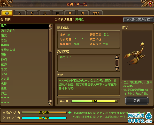 1.毒蜘蛛,等級(jí)13,性別,男,變身加成,法攻強(qiáng)度+60.等級(jí)低,前期法系職業(yè)可輕松刷出。