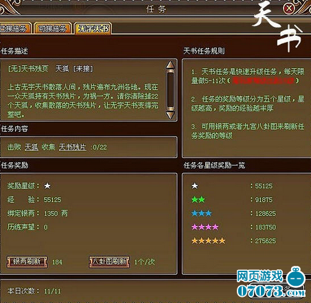 可用銀兩或者九宮八卦圖來刷新任務(wù)獎勵的等級。