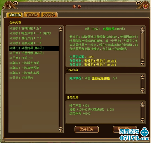 師門任務(wù)即環(huán)任務(wù)的一種,由本門師長發(fā)布,30級(jí)后可以接取。每日可完成20環(huán)。每環(huán)經(jīng)驗(yàn)獎(jiǎng)勵(lì)都會(huì) 增加。