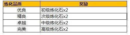 活動內(nèi)容:活動期間,煉化獲得不同品質(zhì)的裝備,則可獲得對應(yīng)的煉化石,獎勵可重復(fù)獲得