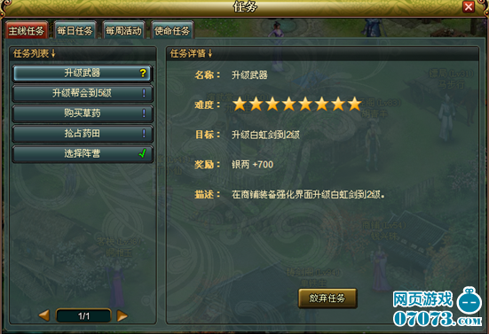 主線任務:引導玩家一步步熟悉游戲的各種功能、系統(tǒng)。任務為接續(xù)形式,必須首先完成低級任務才能出現(xiàn)后續(xù)任務。熱血武林最給力的任務玩法,羅列最全的任務描述,銀兩獎勵盡收眼底。
