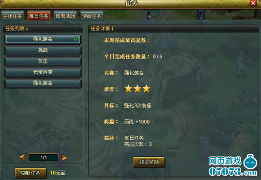 每日任務:40級開啟每日任務,每天最多完成6個。每日任務的級別越高,獲得獎勵越多,獎勵為歷練和內夾心法秘籍?梢允褂媒饚艁硭⑿氯蝿樟斜,以獲得更好的任務。每日任務可以花費10金幣直接完成。