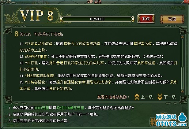 ② Vip等級可進(jìn)行升級,顯示vip8為當(dāng)前的vip等級,10/50000表示已充值元寶數(shù)量/升級vip所需的元寶數(shù)量。