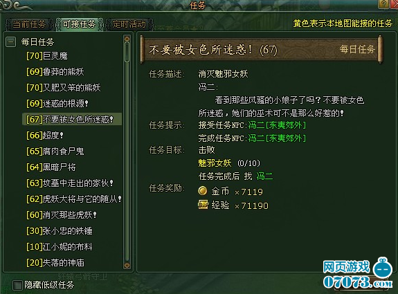 在可接任務(wù)內(nèi)顯示玩家當(dāng)前可以接但是還沒有接的任務(wù),玩家選中任務(wù)后,同樣可以在右邊查看任務(wù)描述、任務(wù)提示和任務(wù)目標(biāo)。在任務(wù)提示和任務(wù)目標(biāo)的介紹中,玩家會看到有部分文字帶有下劃線,點擊帶下劃線的文字,如果下劃線的文字所指向的目標(biāo)與玩家所在的地圖相同,則可以自動移動到下劃線所指向的目標(biāo)附近。