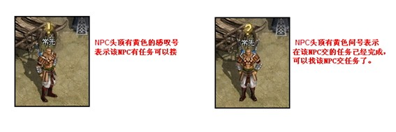 除了在任務(wù)面板里面可以查看任務(wù)情況,玩家也可以直接通過NPC頭頂顯示的問號、感嘆號等情況獲得在該NPC處的任務(wù)信息。