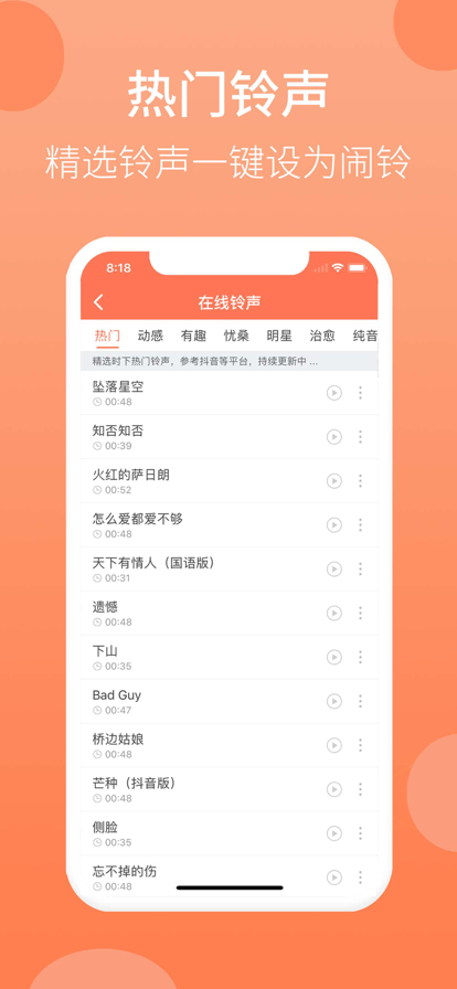 熱門鈴聲:精選熱門鈴聲,還有明星喊你起床,起床更有動力。鈴聲庫持續(xù)更新,緊跟流行趨勢。