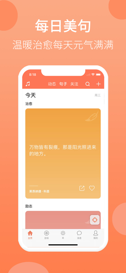 每日美句:每天早晨更新句子,、有趣、勵志等你發(fā)現(xiàn),新的一天元?dú)鉂M滿。這些精選語句來自名人名言、經(jīng)典文學(xué)等優(yōu)質(zhì)來源,為用戶提供精神食糧。