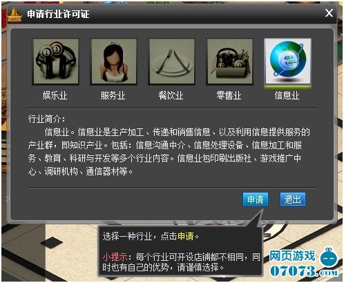 《商界傳奇》提供了5種最具代表性的經(jīng)營行業(yè)供玩家選擇,它們分別是:娛樂業(yè)、服務(wù)業(yè)、餐飲業(yè)、零售業(yè)和信息業(yè)。