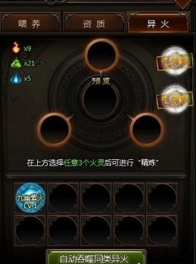 異火使用火靈進行精煉,一共有3中火靈,不同的火靈搭配精煉可以獲得不同效果的異火,這個就看個人需要進行精煉了,個人建議“帝炎”跟“嗜血吞炎”這兩個是不可少的。