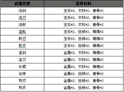 法寶煉制時(shí),將根據(jù)不同的武器類型,需求不同的法寶材料,詳細(xì)見下表: