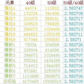 下圖是40級和50級各元素所需經(jīng)驗(yàn)以及之間的比例: