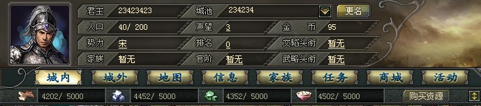 在游戲主界面可以看到每座城池的4種常規(guī)資源儲備量、儲備上限、每小時產(chǎn)量。