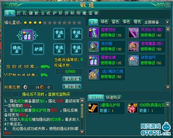 例如,7星需要的祝福值是300,每次用中級(jí)武器強(qiáng)化石可以獲得6點(diǎn)祝福值,那么只要強(qiáng)化50次,就能100%把裝備提升到7星。