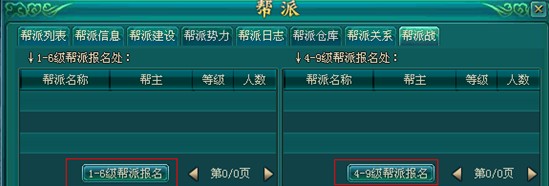 打開幫派面板,點擊“幫派戰(zhàn)”標簽頁,可根據(jù)幫派等級進行報名,1—6級幫派為一個級別,4—9級幫派為一個級別