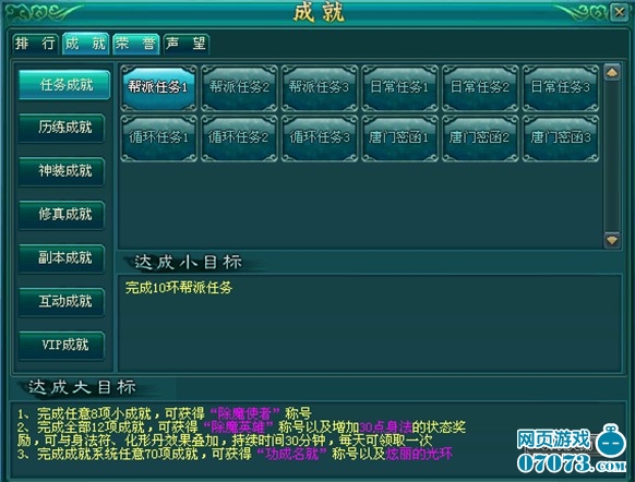 唐門(mén)推出了全新的成就系統(tǒng),在全新的成就系統(tǒng)中,分為任務(wù)成就、歷練成就等7大模塊,完成每個(gè)大模塊的成就,可以獲得傲人的稱(chēng)號(hào)以及增加50點(diǎn)力量、體質(zhì)等各種屬性的增益效果,大大增強(qiáng)你的戰(zhàn)斗力,另外,完成任意70項(xiàng)小成就、完成VIP成就,還能獲得炫麗的光環(huán)效果!