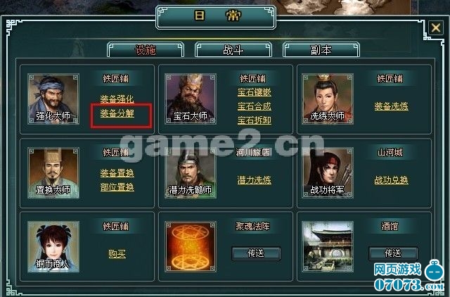 首先點(diǎn)擊日常面板,點(diǎn)擊設(shè)施中的強(qiáng)化大師-裝備分解.