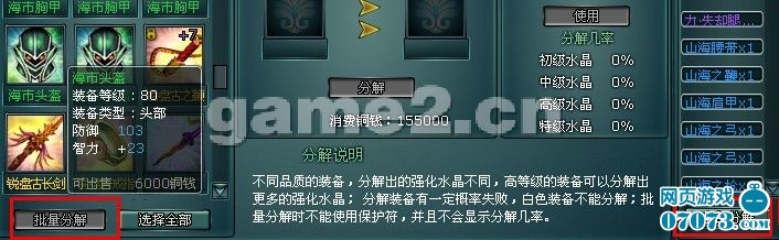 如果需要分解大量的裝備,大家可以使用批量分解的功能,點(diǎn)擊批量分解,選擇好需要分解的裝備,全部分解即可。