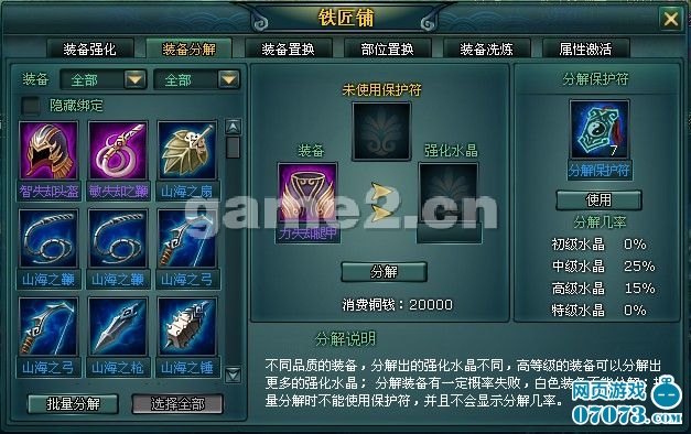 紫色裝備分解后,有一定幾率獲得中級和高級水晶。