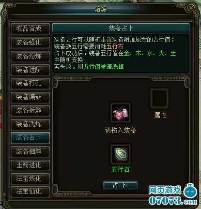 裝備未有五行值時,對其進行占卜則有幾率讓裝備隨機獲得五行值其中之一