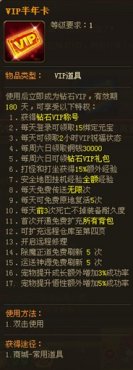 測試期的時候會送大量元寶,所以不要吝嗇半年卡這幾千元寶,半年卡其中的15%經(jīng)驗加成可是相當(dāng)逆天的存在,進(jìn)入副本或者野外掛機(jī)的時候吃個經(jīng)驗符+半年卡15%的經(jīng)驗加成,那等級可以刷刷的往上漲。每天兩個小時的VIP祝福狀態(tài)讓你的副本刷怪生涯變得更加的方便與快捷。