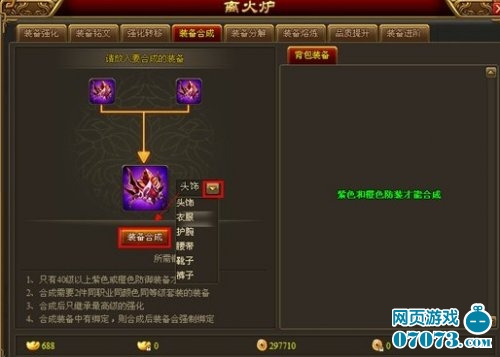 1、只有40級以上紫色或橙色防御裝備才能進行合成;
