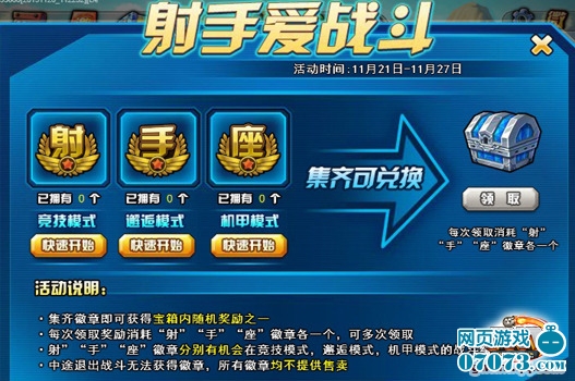 活動(dòng)內(nèi)容:參與競技、邂逅、機(jī)甲模式有機(jī)會(huì)獲得“射”“手”“座”字徽章,集齊徽章后可兌換獎(jiǎng)勵(lì),不限次數(shù)。