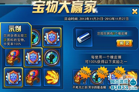 活動期間,玩家可以在活動頁面消耗10Q幣使用1個橡皮擦分3次刮開涂層。涂層刮開后,玩家可以100%獲得出現(xiàn)了3次圖標(biāo)的寶物或?qū)毼锼槠。獎勵包括不死鳥之羽1至3級、北境紋章1至3級、勞爾的狙擊鏡1至3級以及橙色寶物碎片。土豪金的寶物碎片也是合成精品寶物的必備材料,近距離接觸頂級寶物的機(jī)會絕不容錯過。