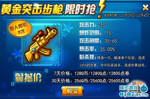 活動(dòng)內(nèi)容:A級(jí)武器限時(shí)售賣,活動(dòng)期間每人限購(gòu)2次。