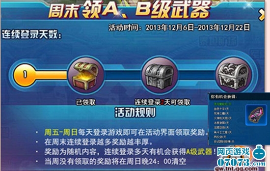 活動內(nèi)容:每周五到周日登錄游戲即可免費(fèi)領(lǐng)取B級武器!每周連續(xù)登錄越長時間,領(lǐng)取的獎勵越好!連續(xù)登錄3天即有機(jī)會贏得A級武器!