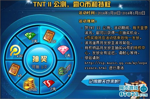 活動內(nèi)容:賀TNTⅡ公測,活動期間,每天登錄游戲,都可獲得一次抽獎機會。最高可獲得100Q幣哦!