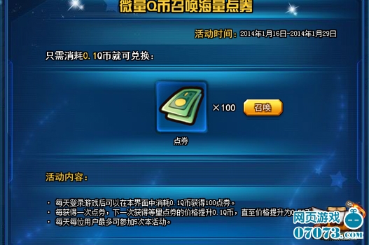 活動(dòng)內(nèi)容:每天登錄游戲可在活動(dòng)界面用0.1Q幣兌換100點(diǎn)券;每次兌換后下次兌換價(jià)格需提升0.1Q幣,每位用戶每天最多能參加5次活動(dòng)。