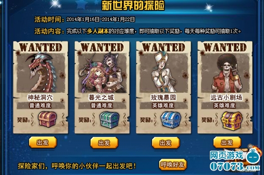 1月16日至1月22日,《TNT II》推出“新世界探險”活動。在此期間T友每天完成多人副本普通難度神秘洞穴、暮光之城,英雄難度玫瑰墓園、遠古小劇場,即可在指定活動頁面打開相應的寶箱。通關副本的普通難度后即可解鎖副本的英雄難度。每天每種獎勵只可抽取一次,未抽取的獎勵會在當日內(nèi)清空。感受全新的游戲體驗,領取額外的豐厚獎勵,充滿歡樂和驚喜的新世界等著你去探索!