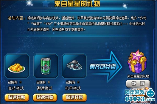 活動內(nèi)容:活動期間,參與競技/邂逅/機甲模式搜集炸雞/啤酒/UFO即可兌換來自星星的禮物。