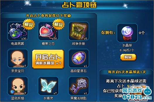 活動內(nèi)容:活動期間,開啟水晶球占卜就有機會獲得項鏈,每開啟5個水晶球還會贈送1個水晶球。參與多多獎品多多。