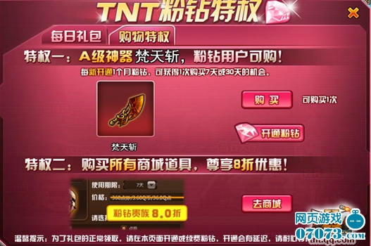 粉鉆用戶的購(gòu)物特權(quán)升級(jí)為A級(jí)武器梵天斬!4月3日更新后,每新開通1個(gè)月粉鉆即可獲得一次購(gòu)買7天或30天梵天斬的機(jī)會(huì),購(gòu)買時(shí)需要有粉鉆用戶身份。4月3日停機(jī)時(shí)已經(jīng)是粉鉆貴族的用戶,更新后將直接獲得1次購(gòu)買機(jī)會(huì)。