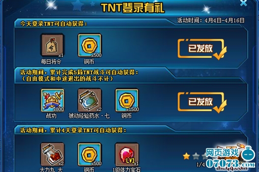 活動(dòng)內(nèi)容:從QQ水滸活動(dòng)中心的“TNT有禮活動(dòng)”進(jìn)入TNT,登錄即可獲得每日將令*1,銅幣*500,每天可領(lǐng)取一次。