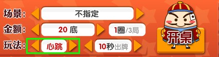 在開局結(jié)束發(fā)牌之后,玩家可以選擇是否進(jìn)行心跳,選擇心跳的玩家會隨機(jī)抽取一張牌與玩家手中牌做對比,如果點數(shù)不同,則沒有跳中;如果點數(shù)相同,則玩家明牌,明牌張數(shù)與點數(shù)相同,底分與點數(shù)相乘,做為新的底分。