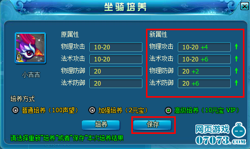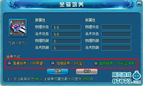 坐騎培養(yǎng)這是一個新功能,現(xiàn)在的坐騎不僅僅可以提高人物的行走速度,還可以增加攻擊和防御屬性了。