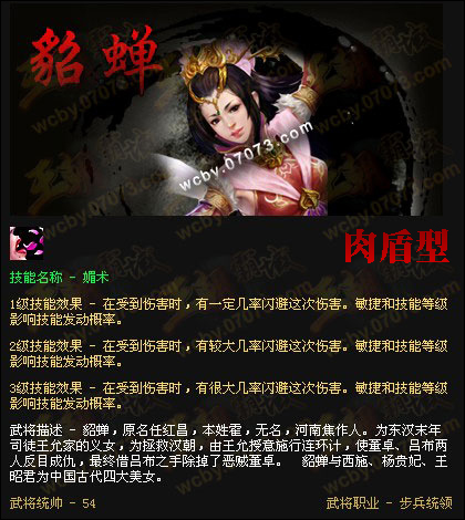貂蟬媚術(shù)技能:技能效果在受到傷害時(shí),有一定幾率閃避這次傷害。敏捷和技能等級(jí)影響技能發(fā)動(dòng)概率。貂蟬可以帶任何兵種,使用面較廣。是一個(gè)全能型由于貂蟬的技能發(fā)動(dòng)是看敏捷,和技能等級(jí)。敏捷越高發(fā)動(dòng)幾率越大,只要發(fā)動(dòng)技能別人打她就是MISS。一個(gè)600多敏捷的貂蟬出打先鋒,可以MISS好多敵人。所以說她是一個(gè)高效肉盾。