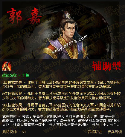 技能效果作用于自身以及5*5范圍內(nèi)的任意10支友軍,3回合內(nèi)提升較少攻擊力和的機(jī)動(dòng)力。智力和技能等級(jí)提升技能效果和技能發(fā)動(dòng)概率。郭嘉最好帶弓或戰(zhàn)車,這樣給附近的高攻遠(yuǎn)程部隊(duì)增加攻擊力。