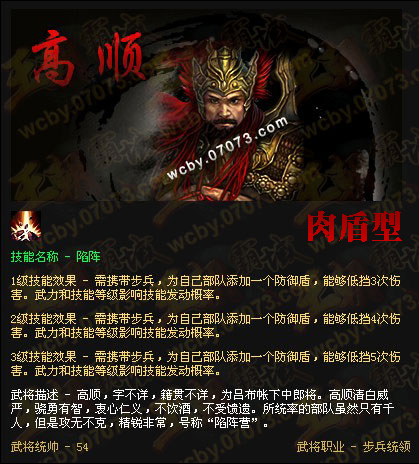 技能效果需攜帶步兵,為自己部隊(duì)添加一個(gè)防御盾,能夠低擋3次傷害。武力和技能等級(jí)影響技能發(fā)動(dòng)概率。高順必須帶步兵,因?yàn)楦唔樀募寄苄枰獛Р奖l(fā)動(dòng),根據(jù)武力和技能等級(jí)發(fā)動(dòng),發(fā)動(dòng)之后5次挨打全是MISS。所以說高順也是高效肉盾。