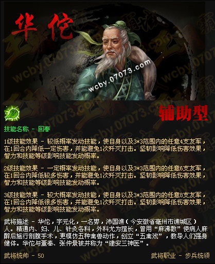 較低概率發(fā)動(dòng)技能,使自身以及3*3范圍內(nèi)的任意4支友軍,在1回合內(nèi)降低一定傷害,并能避免1次殲滅打擊。堅(jiān)韌影響降低傷害效果,智力和技能等級(jí)影響技能發(fā)動(dòng)概率。華佗作用和劉備類似,但弱于劉備。武將有空余時(shí),第一個(gè)就解雇他。
