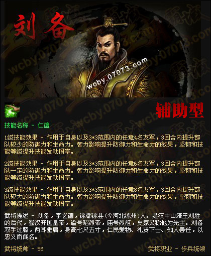 劉備仁德技能:技能效果作用于自身以及3*3范圍內(nèi)的任意4名友軍,3回合內(nèi)提升部隊(duì)較少的防御力和生命力。智力影響提升防御力和生命力的效果,堅(jiān)韌和技能等級(jí)提升技能發(fā)動(dòng)概率。劉備帶步兵,扔到火線城站崗,堵口子,給其它守城部隊(duì)加防御。