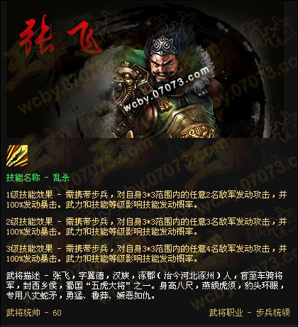 張飛亂殺技能:技能效果需攜帶步兵,對(duì)自身3*3范圍內(nèi)的任意2名敵軍發(fā)動(dòng)攻擊,并100%發(fā)動(dòng)暴擊。武力和技能等級(jí)影響技能發(fā)動(dòng)概率。有人說張飛帶步兵不好用。其實(shí),4級(jí)騎兵跑6格,步兵跑5個(gè)僅差一格,雖然是跑得慢一點(diǎn),但劣勢(shì)并不明顯。國戰(zhàn)時(shí)雙方經(jīng)常處在膠著狀態(tài),武將無需跑太遠(yuǎn),張飛的劣勢(shì)就消失了,他的高防御和攻擊威力能得到有效發(fā)揮。